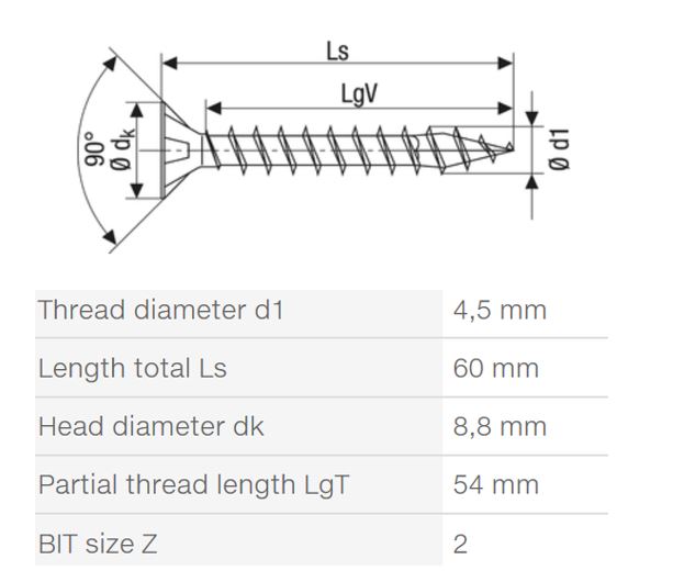 SPAX screw 4.5x60 countersunk head PZ,W,4C MH