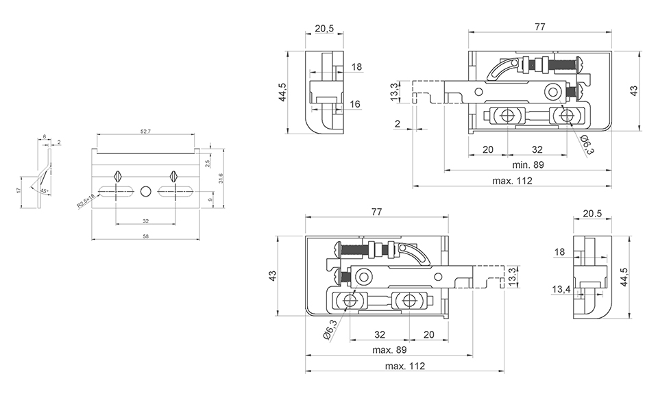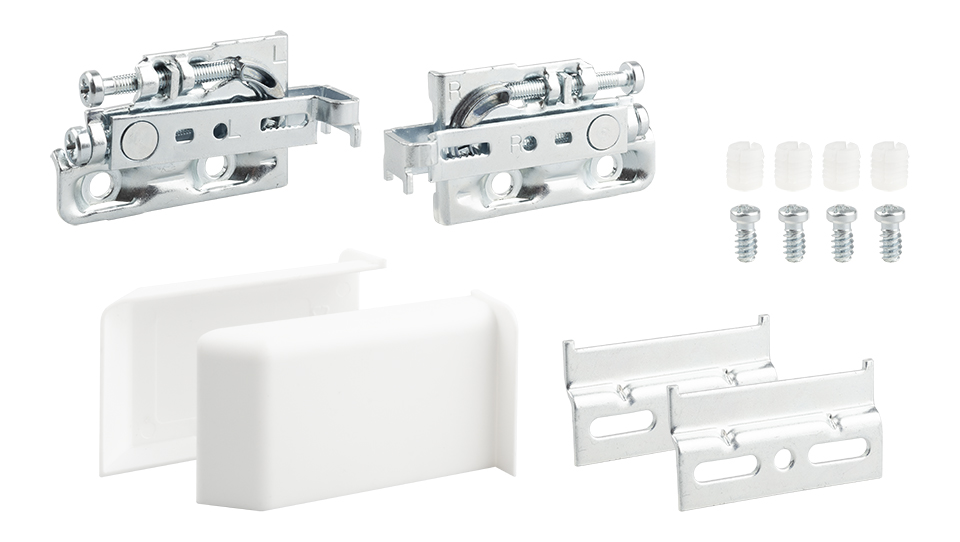 Rectification fitting with white plastic cover, load capacity 150kg per pair. Set includes. - Pair of metal hinge fittings. - Pair of white plastic caps. - 2 pcs of galvanized hinge plates 70x42x6mm - 2mm thick. - 4pcs of euro screws. - 4pcs of dowels for 10mm hole. Height adjustment +/- 8mm, depth adjustment +/- 10mm. On some pieces, the included dowel may rotate when screwing in the included euro screws. It is advisable to consider installation without using dowels using only the Euro screws in pre-drilled holes 5mm diameter. The load capacity with this installation method is max. 80kg/pair. Another option is to drill the holes in the body to a diameter of 9.5mm.