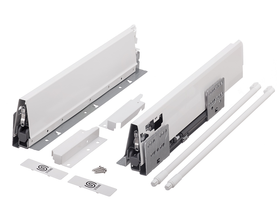 Slide with damping and side plates including 1 pair of railings. Length 270mm, height 140(165mm). Loading capacity do 35kg. Color white. All parts needed to assemble the front drawer in this kit. For inned drawer front panel need to be ordered.