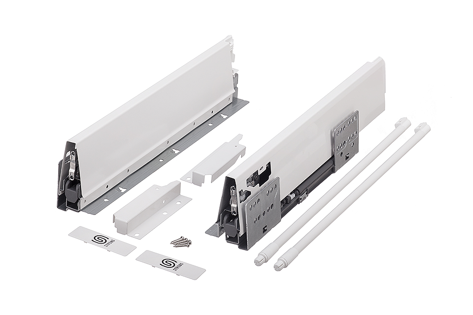 Slide with damping and side plates including 1 pair of railings. Length 450mm, height 204(225mm). Loading capacity do 35kg. Color white. All parts needed to assemble the front drawer in this kit. For inned drawer front panel need to be ordered.