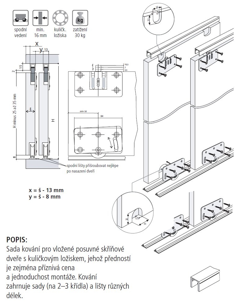set of fittings for inset sliding cabinet doors with ball bearings, load capacity 30 kg/door, set for 3 leaves. Guide in length 1,5m, 2m and 3m. The fittings include sets of top and bottom trolleys + backstop brakes in the appropriate quantity