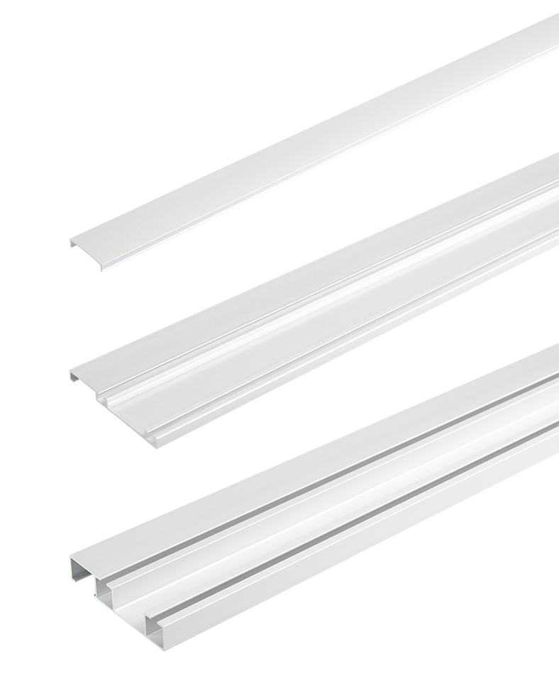 Set of top and bottom guide tracks including a cover profile. Length: 3 m. Finish: silver anodized.