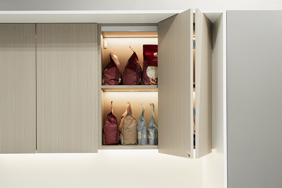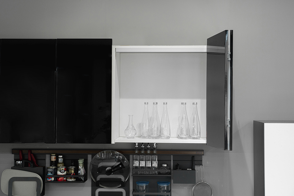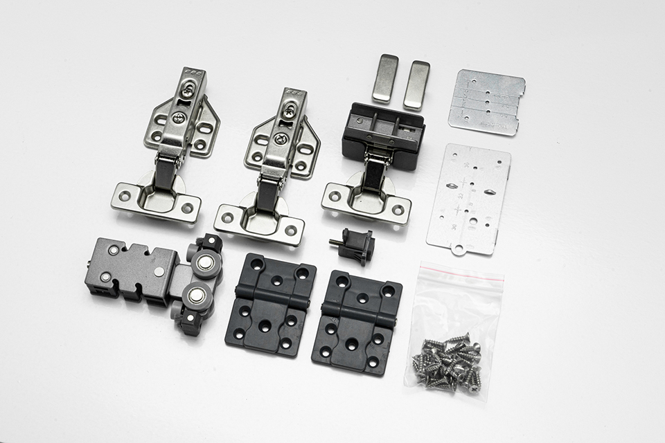 Fitting set for double folding overlay doors without bottom track. Maximum size of one door leaf: 500 × 1200 mm. Material thickness: 18–25 mm.