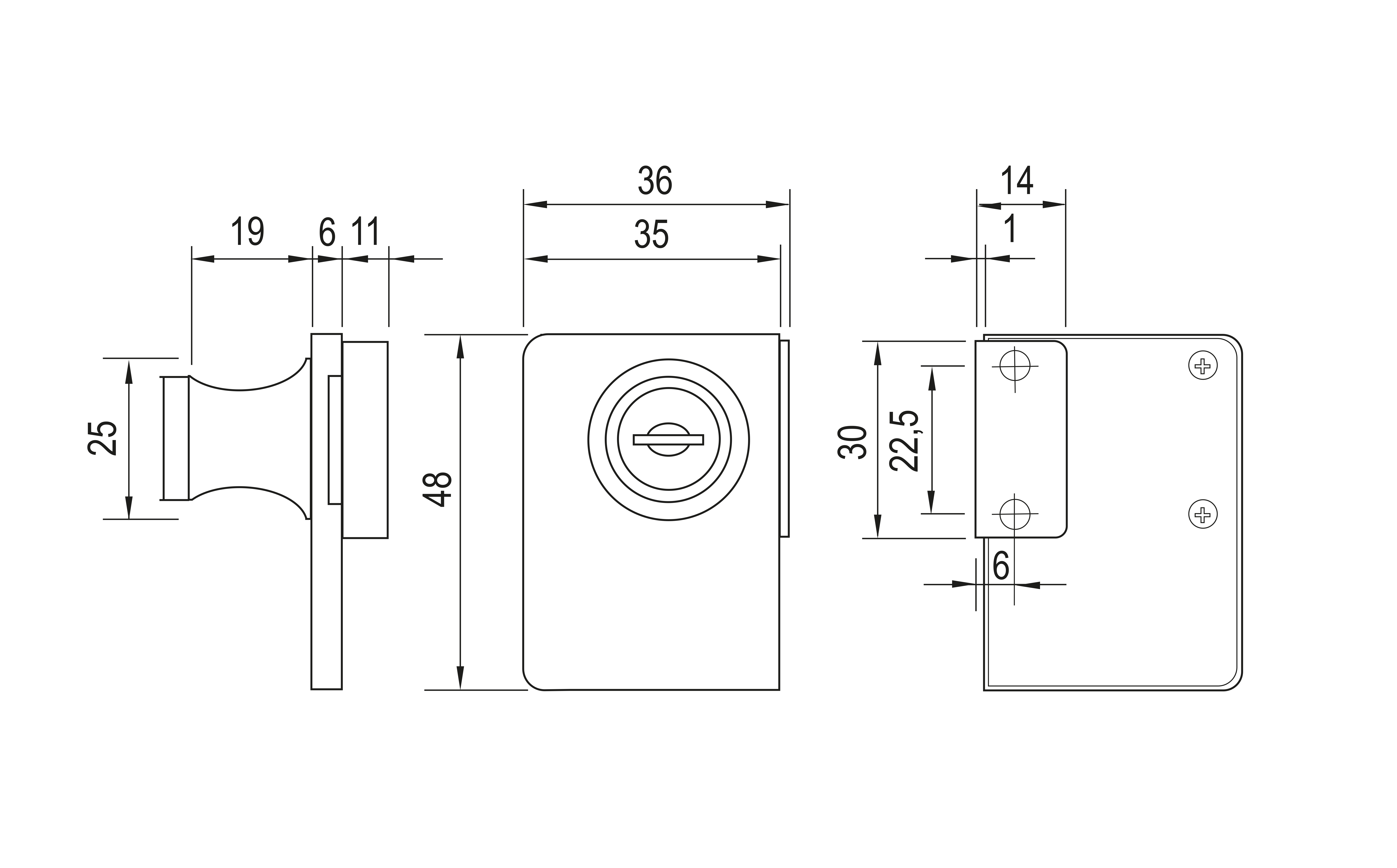 Includes: lock, 2 pcs of M4 screws, 1 pc of plastic underlay, 1 pc of counterpart into the body, 2 pcs of keys. For glass thickness 4 - 8 mm