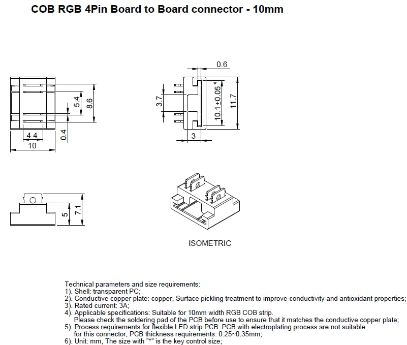 Spojka pro spojení CCT/RGB COB LED pásek - LED pásek. Vhodné pro LED pásky šířky 10mm viz. související sortiment. Spojka se na LED pásek nasadí a pomocí kleští se přitlačí kontaktní trny do LED pásku, kdy se trny poté do LED pásku zaříznou. Spojka je tedy určena pro jedno použití. Pro použití v profilech o min. šířce 12mm a výšce 5,1mm.
