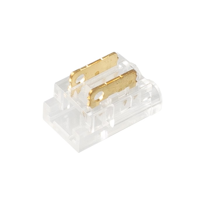 Spojka pro spojení COB LED pásek - kabel (dvojlinka). Vhodné pro LED pásky šířky 5mm viz. související sortiment. Spojka se na LED pásek nasadí a pomocí kleští se přitlačí kontaktní trny do LED pásku, kdy se trny poté do LED pásku zaříznou. Spojka je tedy určena pro jedno použití. Pro použití v profilech o min. šířce 7mm a výšce 5,1mm.