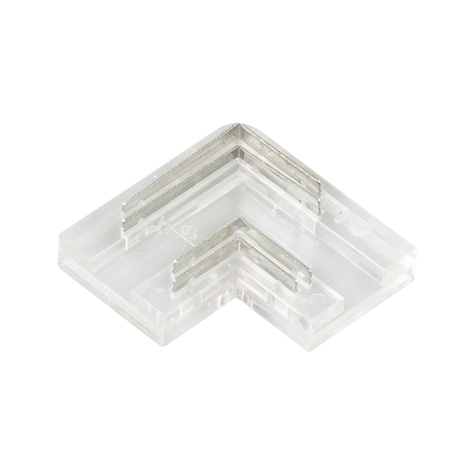 Rohová spojka pro spojení CCT/RGB COB LED pásek - LED pásek. Vhodné pro LED pásky šířky 10mm viz. související sortiment. Spojka se na LED pásky nasadí a pomocí kleští se přitlačí kontaktní trny do LED pásku, kdy se trny poté do LED pásku zaříznou. Spojka je tedy určena pro jedno použití. LED pásky se musí v místě vnitřního rohu překrývat viz. foto. Pro použití v profilech o min. šířce 12mm a výšce 5,1mm.
