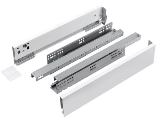 A complete kit for the manufacture of a drawer with a narrow (13mm) hollow sidewall and slides with soft-closing and internal synchronisation. Load capacity up to 40kg. Lifetime of slides minimum 50,000 cycles. Up/down and right/left front adjustment. Full drawer tilt adjustment at the rear of the sidewall (used to adjust the tilt of the front). For the production of the bottom and back, 16mm thick material must be used.
