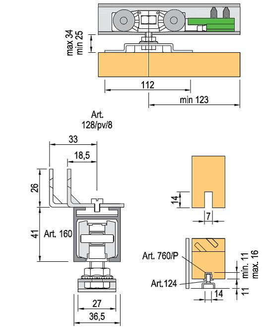Fittings for sliding interior doors up to 160 kg. including 6 profile clips. relevant guide profile = DT305-7 (2-3-6m). Bearings.
