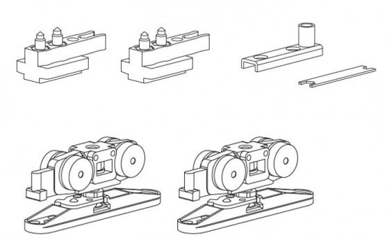 Fitting set for one wing with brake, without damping. Turned wheels without ball bearing. Door load capacity - max. 160 kg. The set includes fittings for 1 wing without wall brackets. Minimum wing width 700 mm. Simple assembly and disassembly, compared to the original Classic version, and easier wing height regulation. The carriage holders can be milled-into the top edge of the door, which reduces the gap between the door and the upper guide profile by up to 11mm.