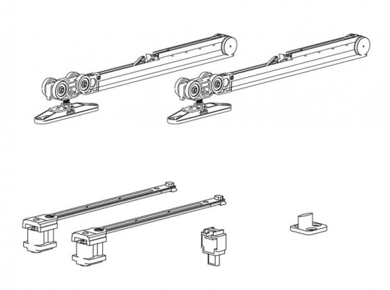 Fitting set for one wing with closing damping. Turned wheels without ball bearing. Door load capacity - max. 50 kg. The set includes fittings for 1 wing without wall brackets. Minimum wing width 740 mm. Simple assembly and disassembly, compared to the original Classic version, and easier wing height regulation. The carriage holders can be milled-into the top edge of the door, which reduces the gap between the door and the upper guide profile by up to 11mm.