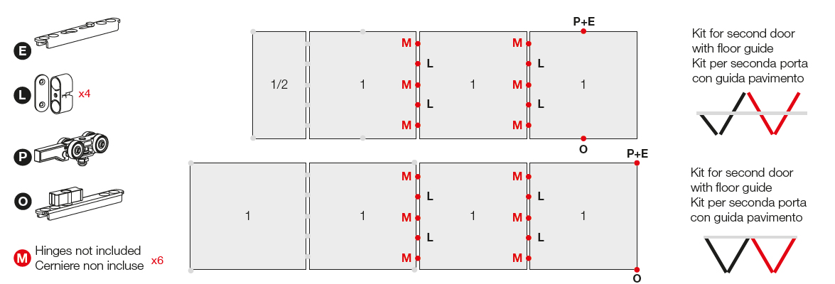 Fitting set for the first biplane. It contains two magnetic arresters, without folding and inter-door hinges. Version without lower guide. For door height max. 2400mm, load capacity 80kg/1 leaf. In the case of four doors - 40kg/1 wing, six doors - 25 - 30kg/1 wing. Material thickness 35 - 45mm. Color black (powder coated).
