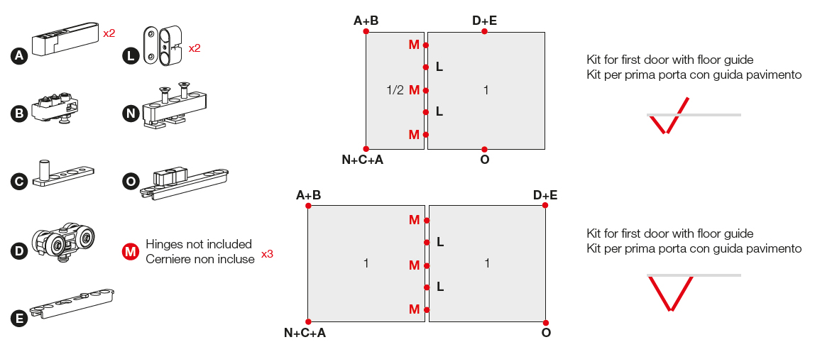 Fitting set for the first biplane. It contains two magnetic arresters, without folding and inter-door hinges. Version without lower guide. For door height max. 2400mm, load capacity 80kg/1 leaf. In the case of four doors - 40kg/1 wing, six doors - 25 - 30kg/1 wing. Material thickness 35 - 45mm. Color black (powder coated).