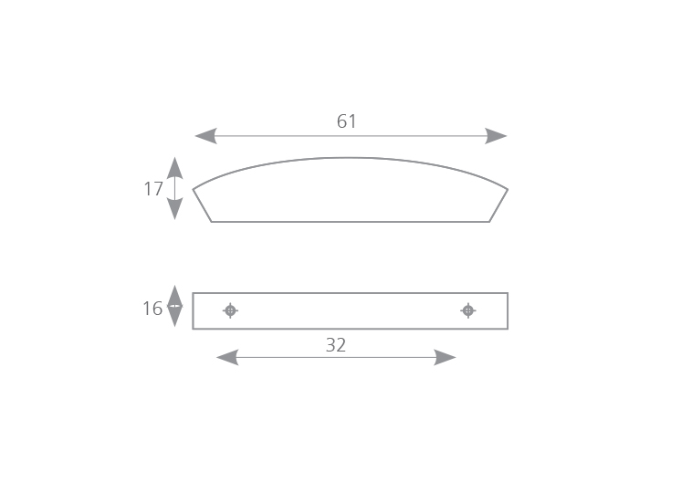handle pitch 32 mm, total length 61 mm, width 16 mm, height 17 mm, brushed nickel surface, includes screws