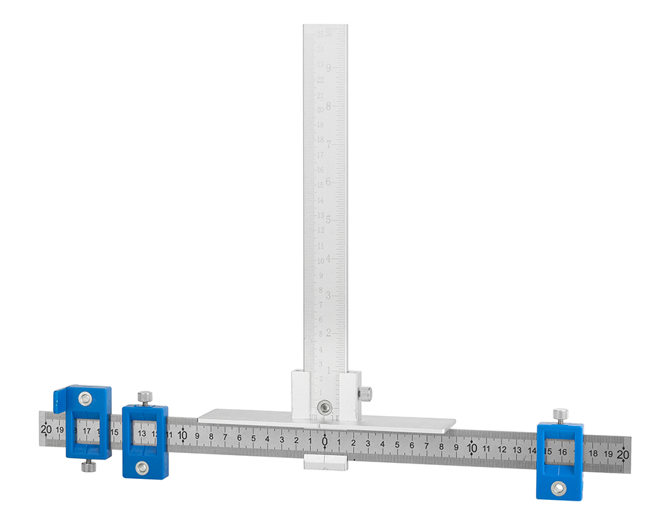Rotatable marking template, adjustment in two directions. For marking the position of holes in System 32 for handles (spacing 32 - 450 mm) and for button handles. Adjustment range: distance from the side edge of the forehead 10 - 334 mm, distance from the bottom edge of the forehead 20 - 65 mm.