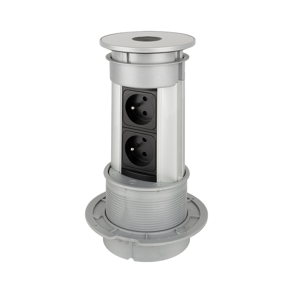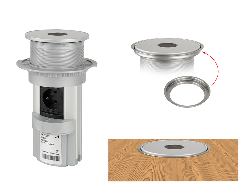 slide drawer system, equipped with 2 el. sockets, designed for placement in the worktop. The body of the drawers is made of aluminum. The package includes a spacer ring (brushed stainless steel) , which allows the system to be recessed into the work surface so that it protrudes only 1 mm above the work surface. The system is supplied with a 1.5 m long connecting cable.