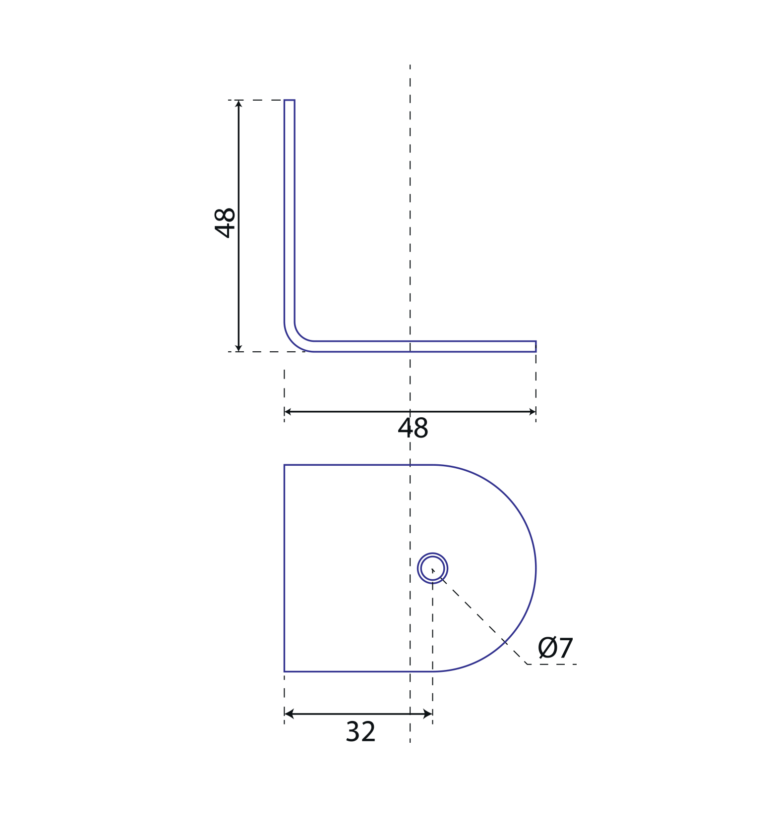 Side length 48mm, angle width 40mm, material thickness 3mm. Diameter of the holes 7mm, chamfering of the edge of the holes from the inside 1.5mm x 45° (diameter of the recessed screw head 10mm). The distance of the axis of the holes from the corner is 32 mm.