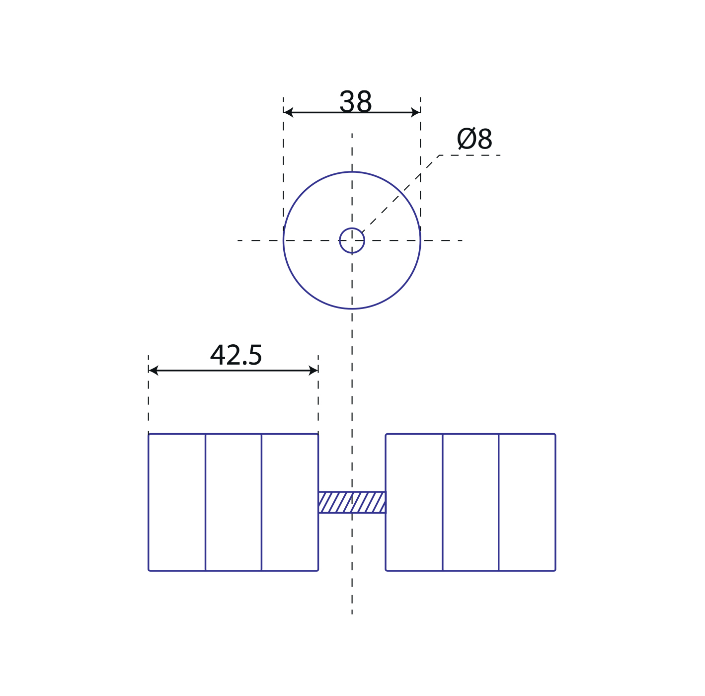 Set of door handles (inner outer) CO-H38 for doors up to 25mm thick. The handle has a diameter of 38 mm and a height of 42 mm, on the bottom side there is an opening with an M8 thread. The set also includes an M8x40mm threaded connecting rod. Installation on the door is done by screwing it through an 8mm diameter through hole.